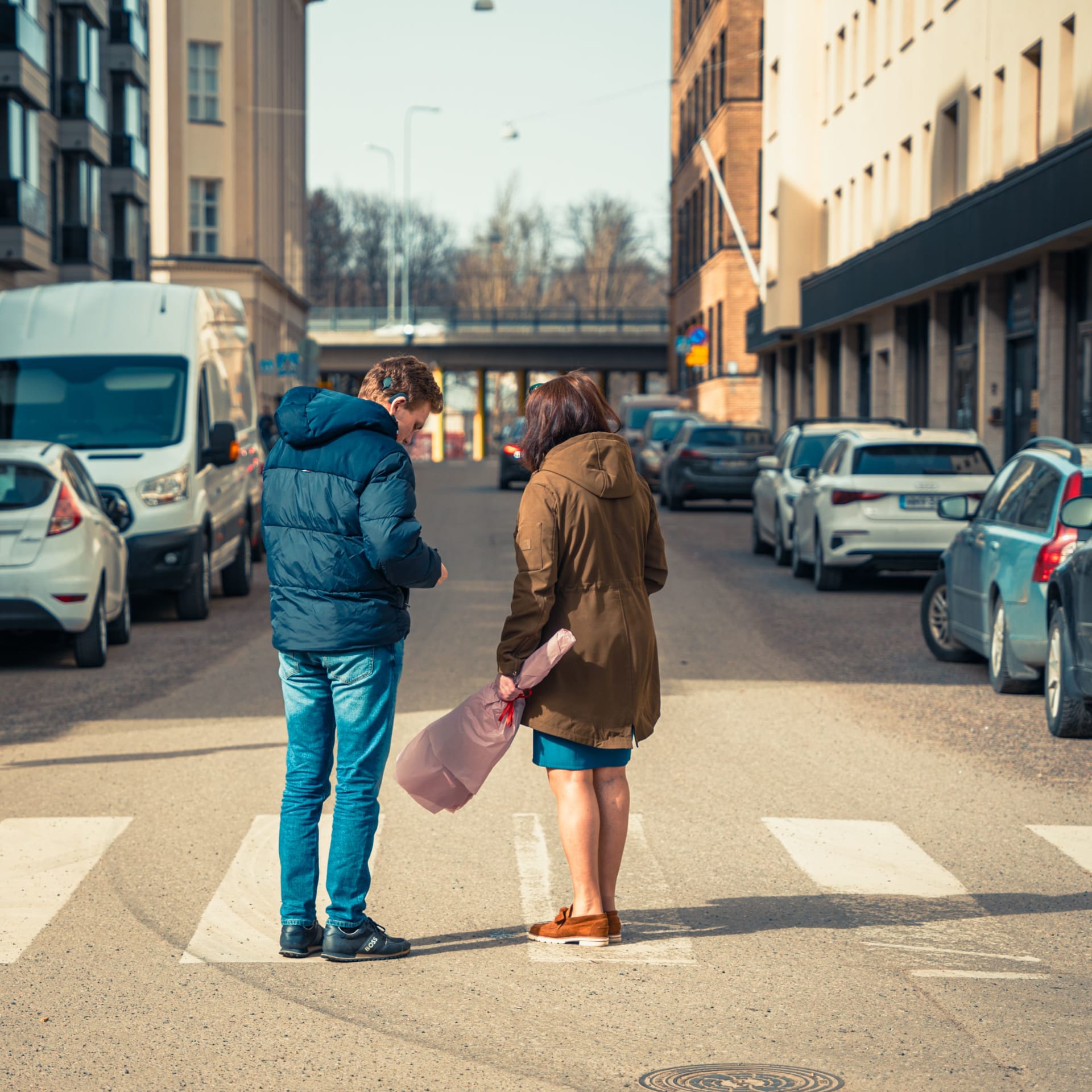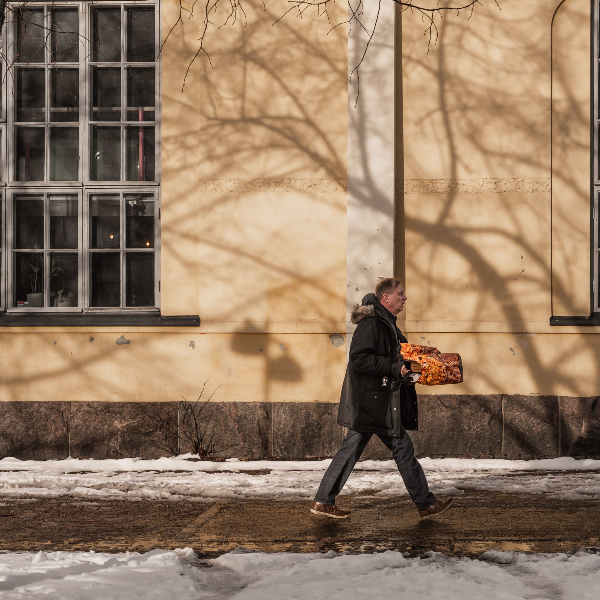 A man on the street seen through a grid